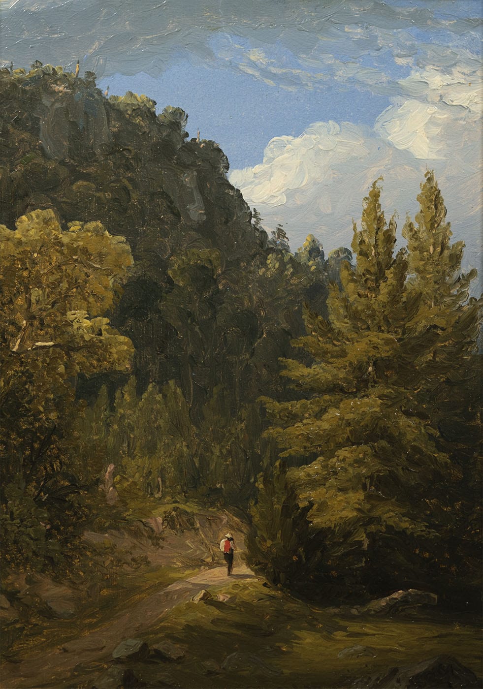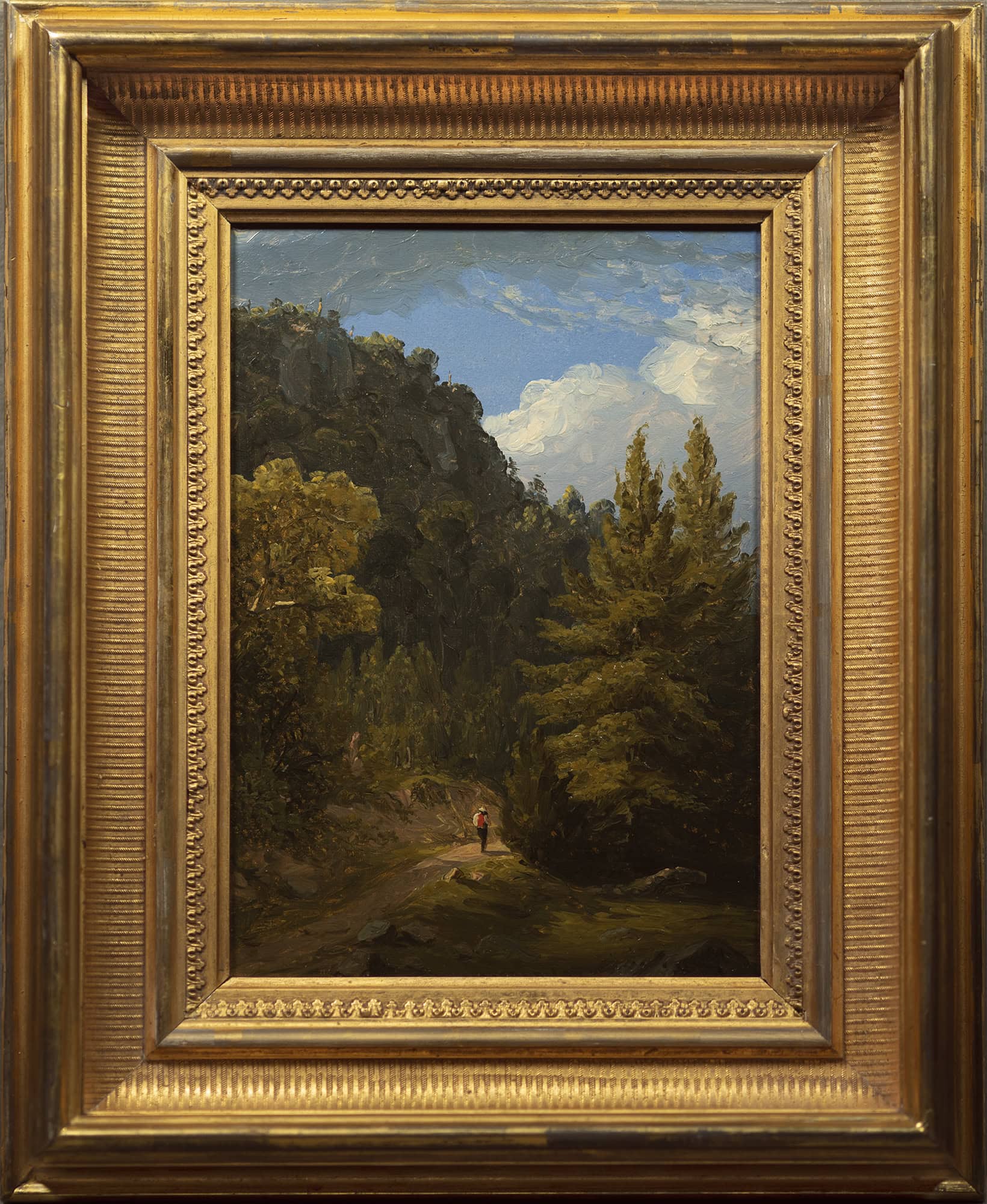 Note: According to scholar Kevin Avery, the upper left corner of the composition may depict an overlook of North Mountain in the Catskills. The related work offers a comparable style of impasto paint application, contours of the foliage, and rapid energy of execution. He suggests that the handling of the paint and presumed subject may date the present work to the early 1860s.