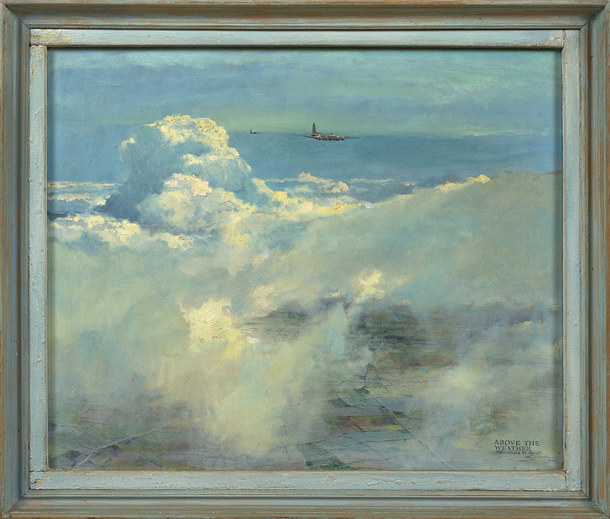 Inscribed, signed, and dated lower right: ABOVE THE / WEATHER / FORTRESSES AT 15000’ / SLOANE / 1945