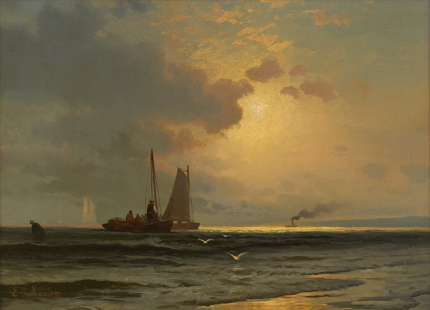 Signed lower left: ED. Moran; on verso: Bay of New York at / Sunrise / Edward Moran 1875