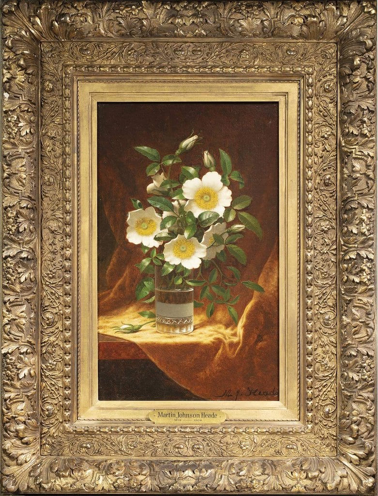 Critics of the time praised his depictions of the Cherokee roses. The St. Augustine Tatler wrote of Heade’s studies “of the Cherokee rose that grows so profusely here, climbing over stumps and hedges, transforming them into things of beauty,” describing them as “wonderfully like; the pure white petals, yellow stamens and glossy, dark leaves are so natural as to deceive.”[2]