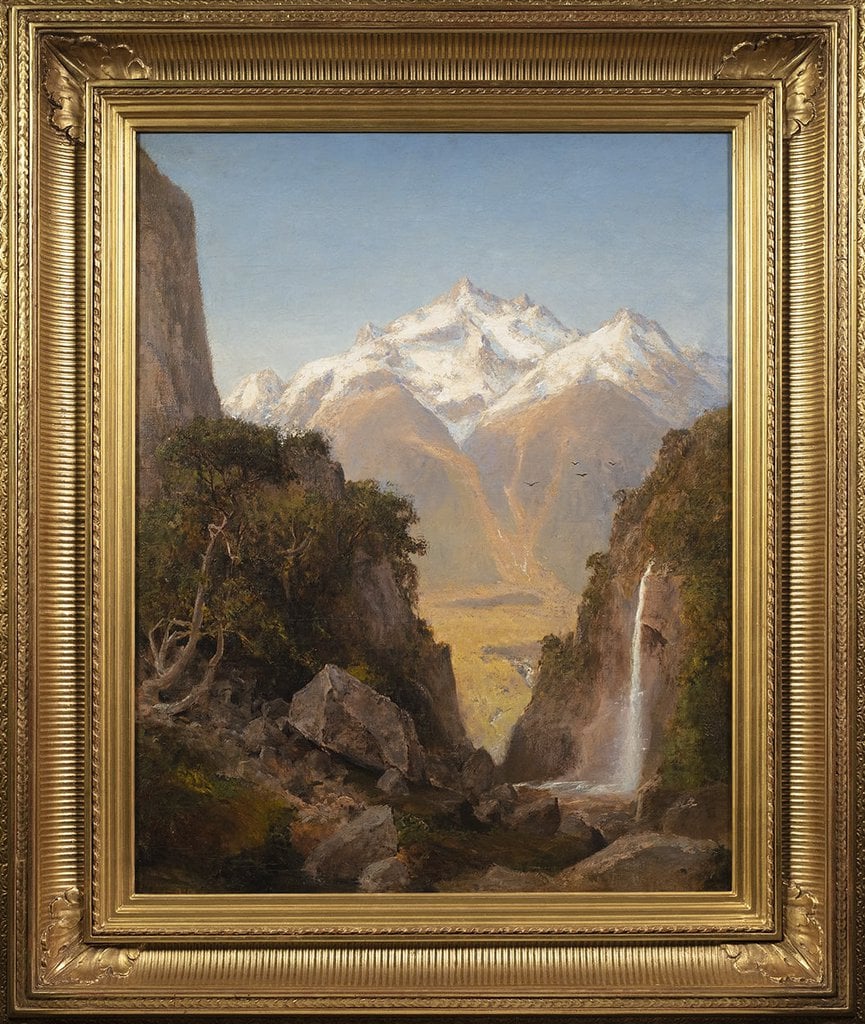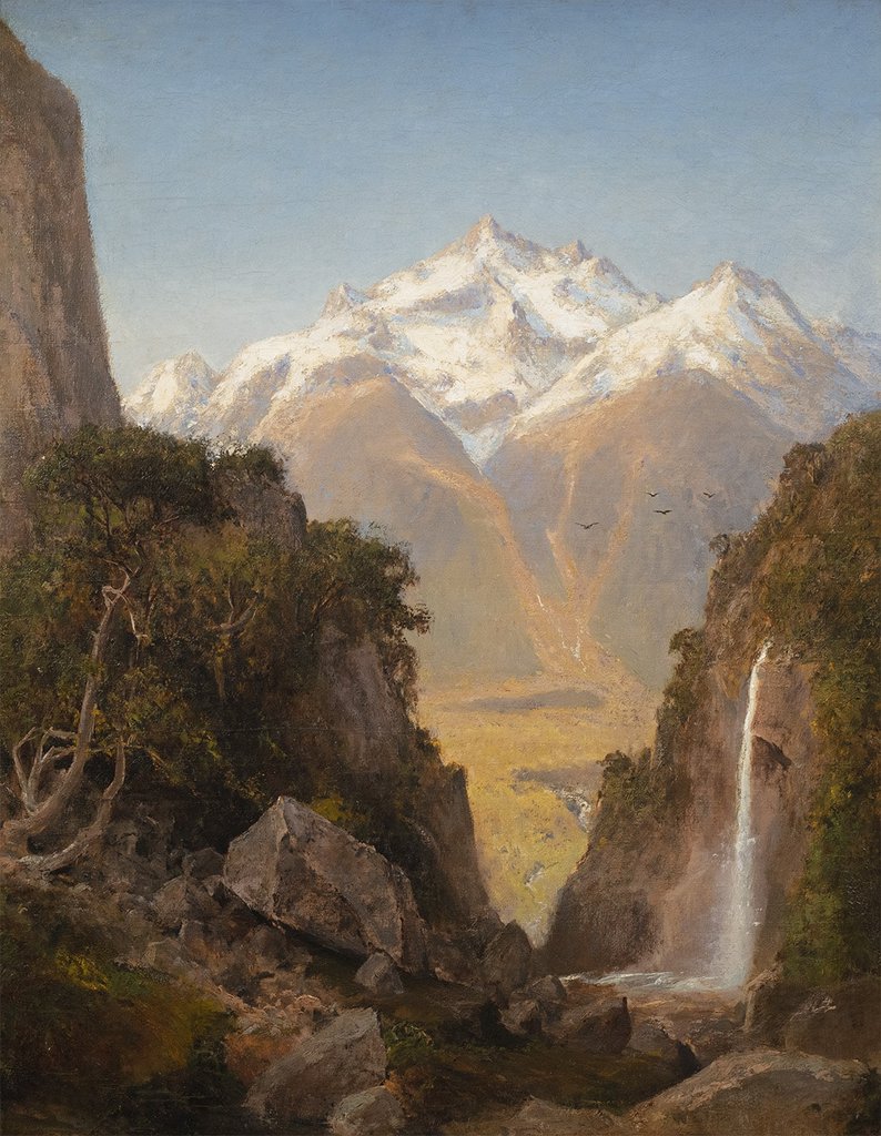 A label on the back reads: “From the rocky gorge, with its vineclad walls and feathery waterfall, are seen the valley and the stupendous snow-capped peaks of the Chilean Andes. Overhead is a blue sky. A subtle feeling of the tropics pervades the canvas.” In the early 1870s Ferguson traveled and painted in South America, with his home base in Santiago, Chile.