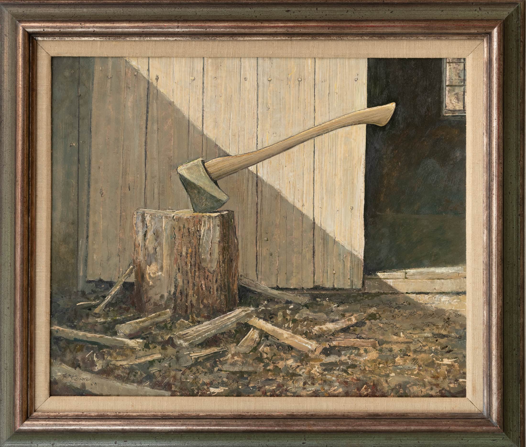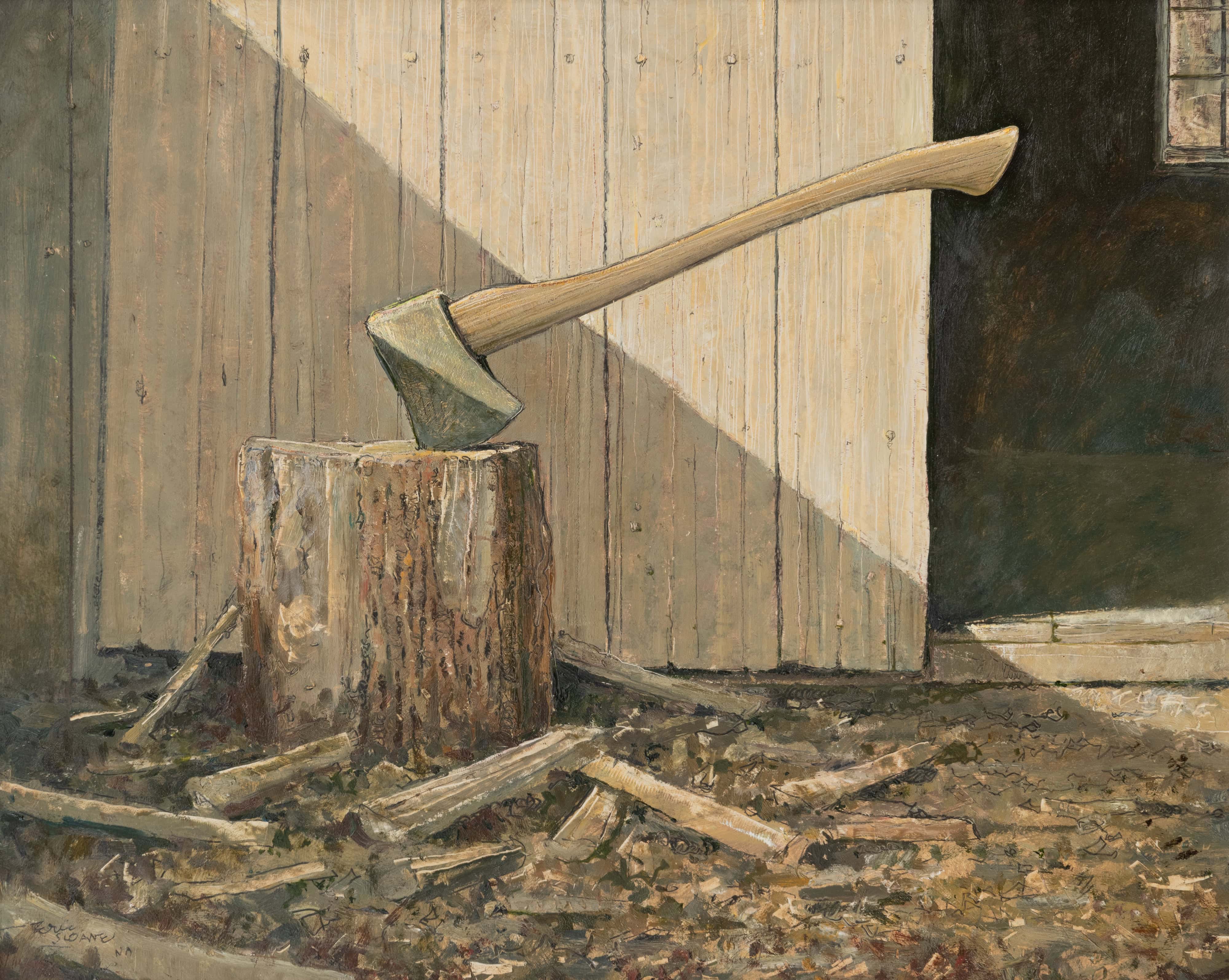 Eric Sloane was widely recognized for his paintings of American landscapes, with barns serving as a central motif. However, he also developed a deep interest in depicting tools, considering them an essential theme for representing Americana. This painting is an exceptional and rare example of Sloane’s works that focus specifically on tools. His passion for painting tools extended beyond the canvas: In the late 1960s, Sloane curated an exhibition for the New Britain Museum of Art, where he mounted a collection of early American tools on boards accompanied by hand-lettered descriptions. Sloane regarded these tools as a significant example of early American art1, reflecting his belief in the cultural and historical value of such objects as symbols of American heritage