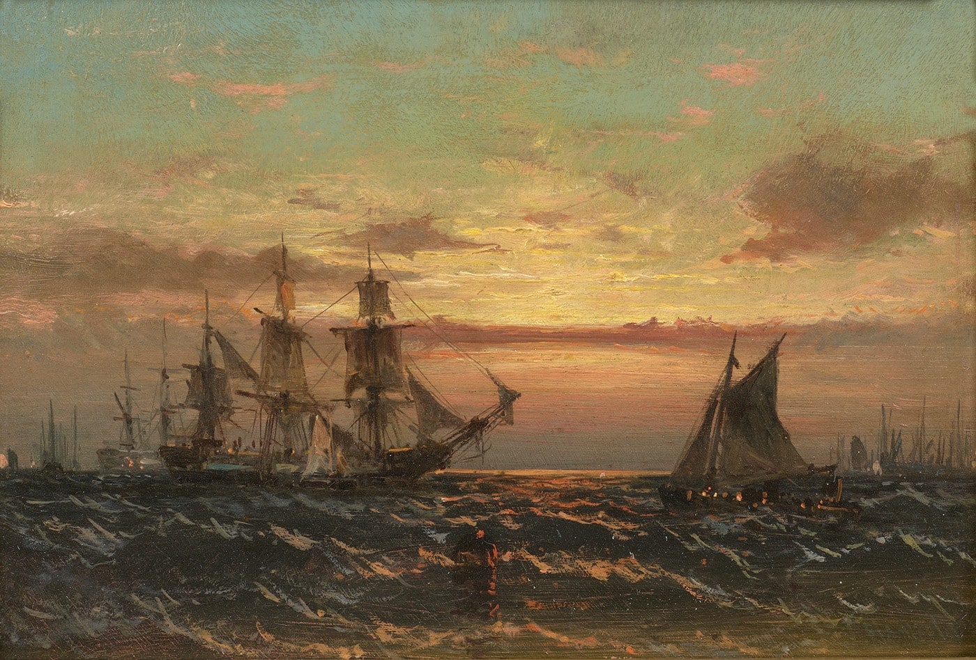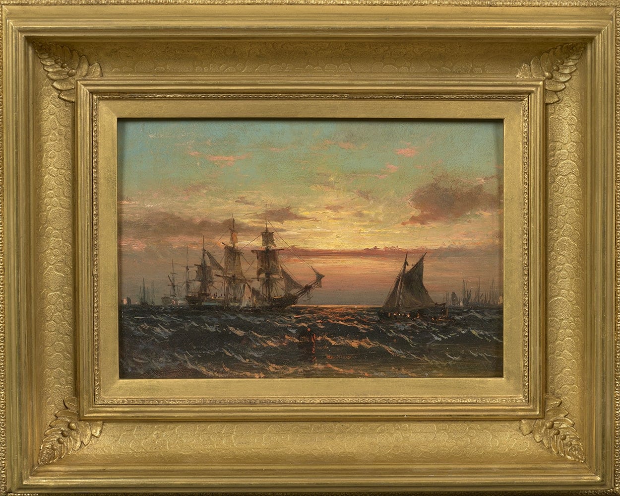 James Hamilton is best recognized for his striking maritime depictions. This painting highlights the artist’s mastery of light, as the orange light gleams across the horizon and reflects onto the dark waves.