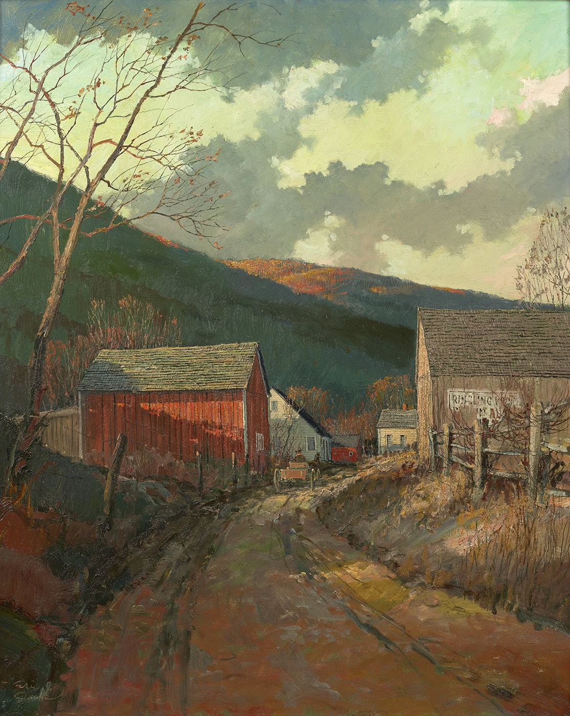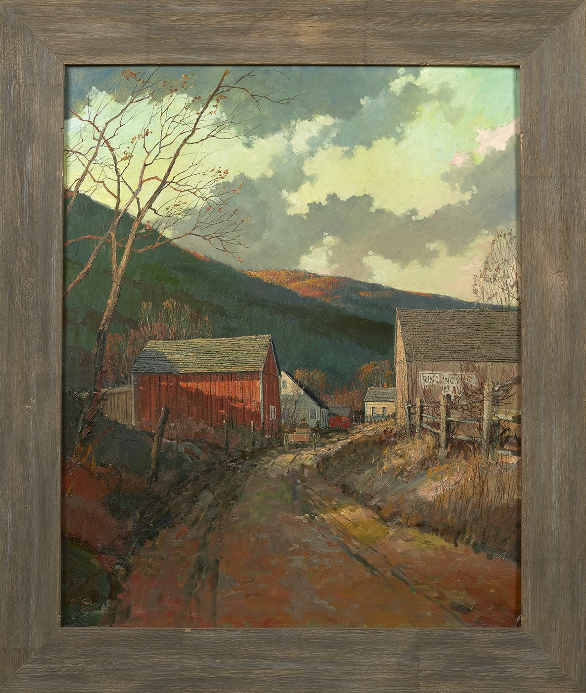 Eric Sloane, entranced by the natural landscapes of America, spent much of his artistic career traveling across the country, articulating these landscapes in his writing, drawings, and paintings. Sloane was particularly drawn to New England in the fall, characterized by rich colors and architectural structures such as barns and covered bridges. In Cornwall Bridge, Connecticut, through vibrant, trodden foliage and crisp shadows, Sloane captures the spirit of the changing seasons and depicts a rural idyll.