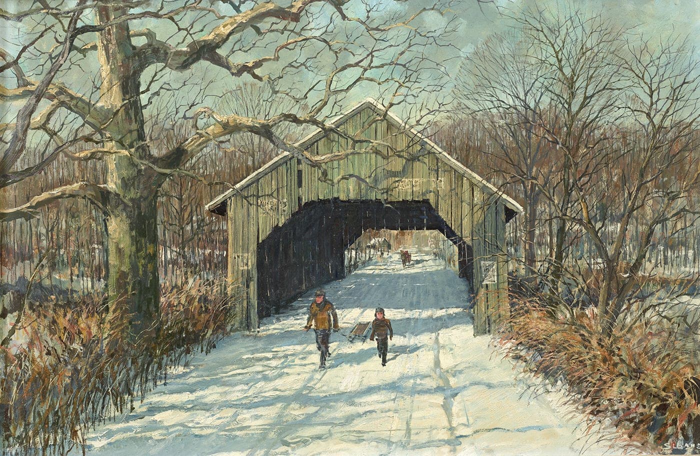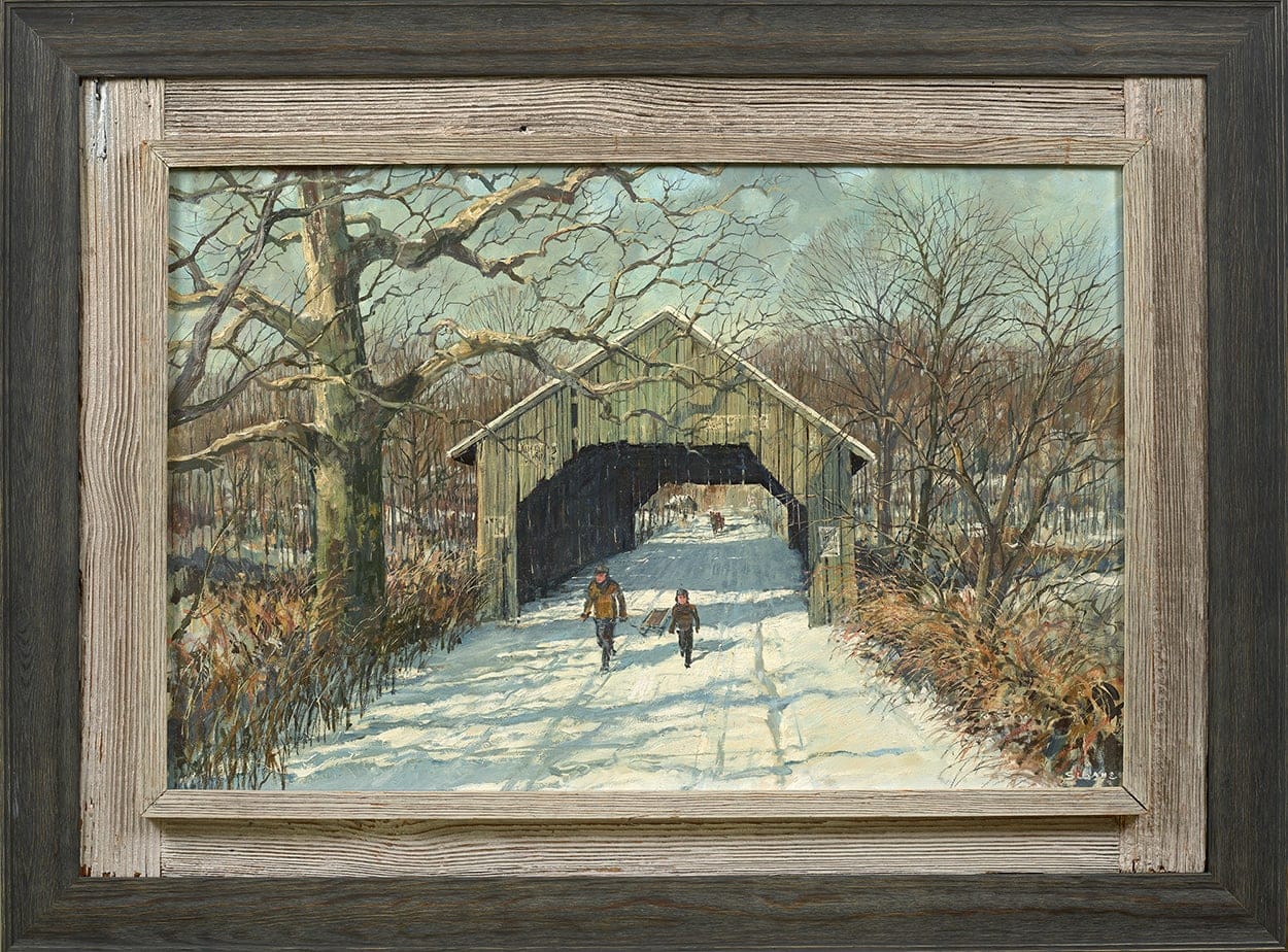 Note: Covered bridges became an important subject matter for Eric Sloane. He traveled to many parts of the country and created his paintings from memory. In his 1985 book, he described, “I wrote the first book about American covered bridges. Since then I probably have painted as many as there are in the country. It was an exciting period in my life, which afforded me a fine consciousness of Americana.”[1]
