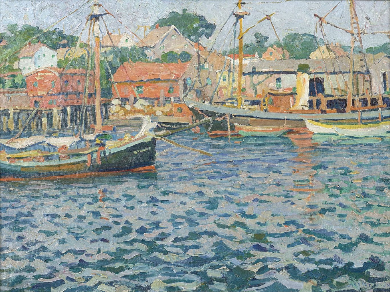Note: This work exemplifies Jane Peterson’s colorful impasto brushwork, which came to characterize her celebrated depictions of Gloucester harbor. A review from 1917 describes, “Miss Jane Peterson uses strong colors and a broad brush to give the facts about docks and fishing craft and harbors in a somewhat knock-you-down fashion.”[1]