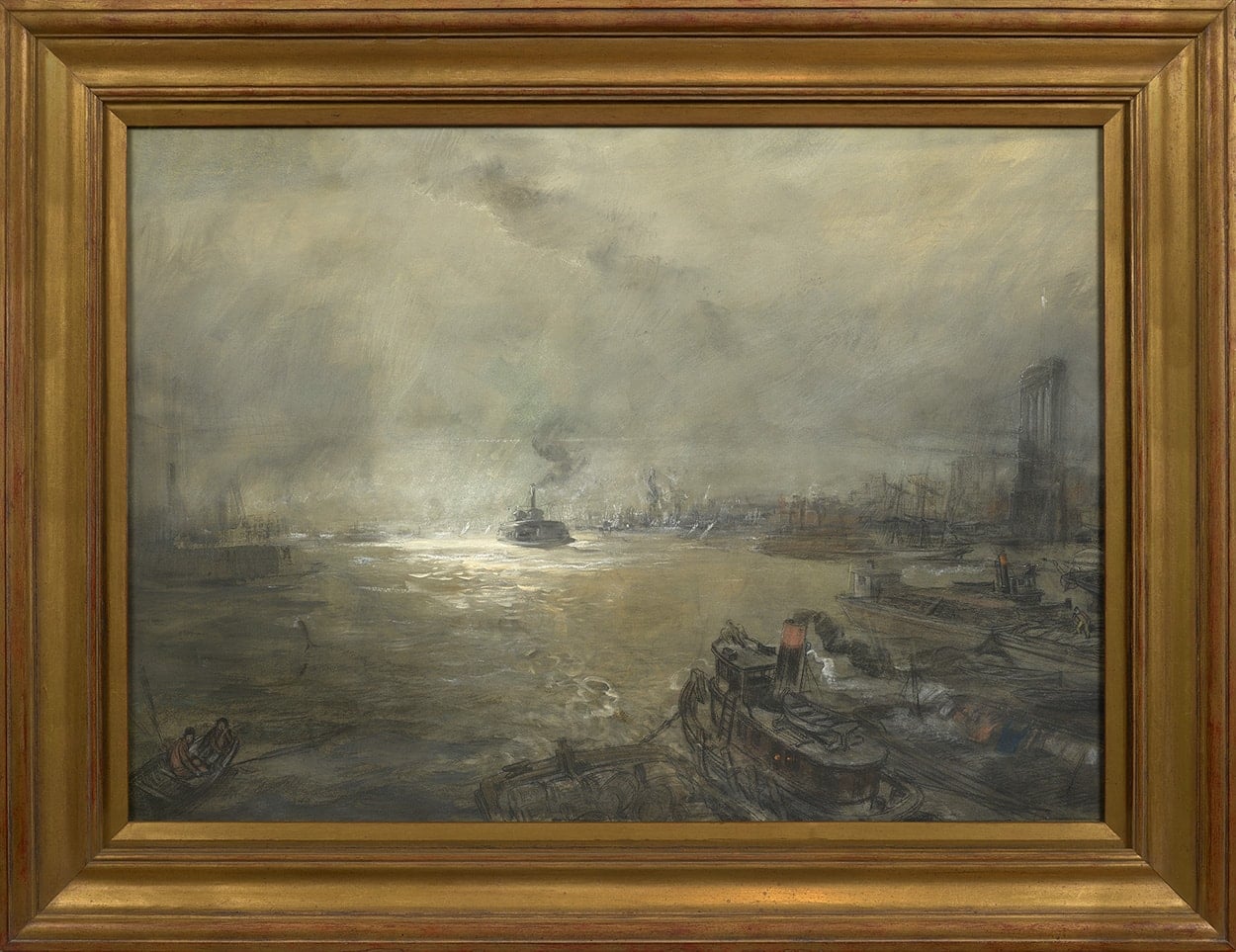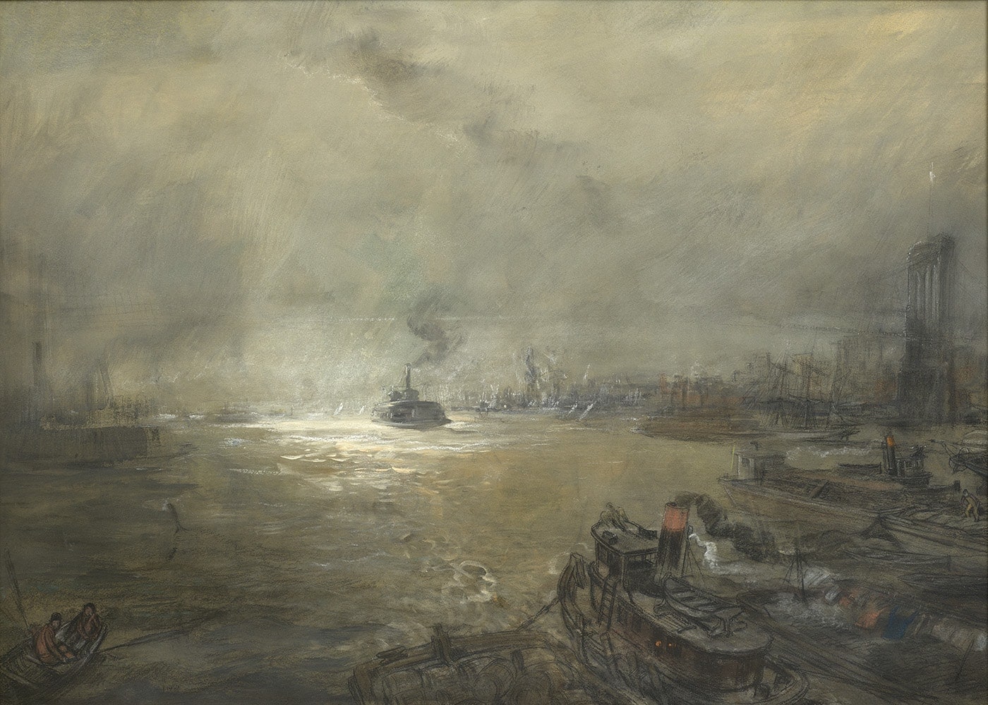 Note: In a smoky neutral palette, Everett Shinn depicts the East River looking towards Brooklyn, New York. The towers of the Brooklyn Bridge are visible on the right and left edges as the sun appears to be rising just beneath the structure, pouring light onto the water. Describing the work, art historian Lisa N. Peters writes, “Rendered in the period when he had had newly arrived in New York, East River Morning conveys the excitement he felt at the beauty and energy of the newly expanded city. The work is an exciting rediscovery.”[1]