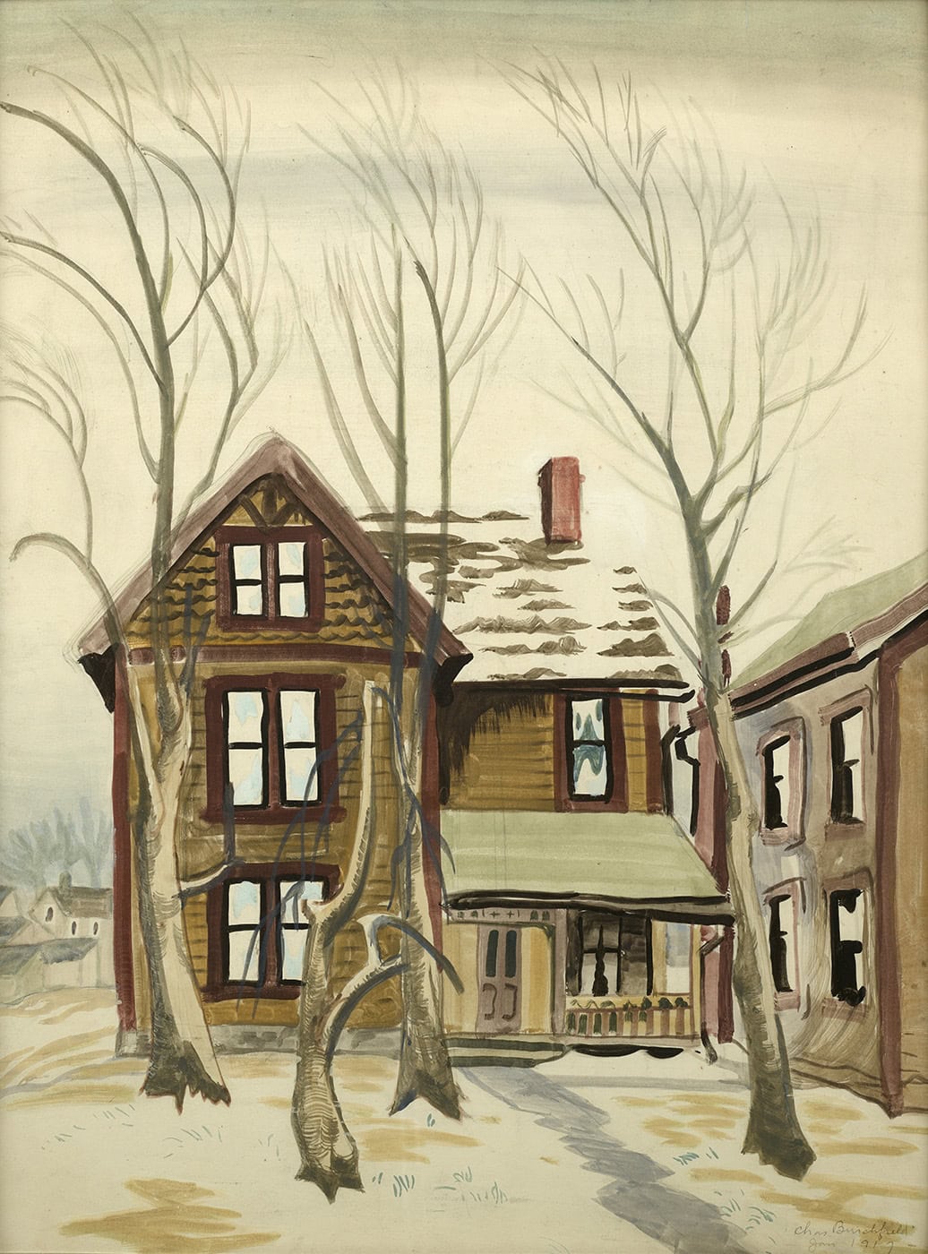 Burchfield referred to 1917 as the ‘golden year’ of his career. He was not only highly prolific with more than 165 paintings but the stylistic directions he had been exploring for years took hold, coming to their fullest expression.[1] During this year, he also painted “house pictures” in his immediate surroundings at Salem, Ohio. Burchfield scholar and art critic Michael Hall describes these works as “a deliberate and structured investigation of a non-traditional form of pictorial composition,” rooted in Post-Impressionism and Expressionism.[2] These paintings laid the foundation for Burchfield’s later role as a leading American Scene painter.