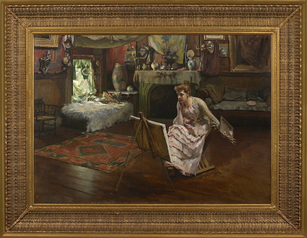 Note: In this work, Irving Ramsay Wiles depicts the studio of his mentor, impressionist painter William Merritt Chase, at the famed Tenth Street Studio Building. The unique building held studios for some of the most prominent nineteenth-century artists and Chase’s studio was well-known as a place of splendor—with rare objects, ornate rugs, and imported porcelain filling the space. Wiles surrounds the elegantly dressed figure with these wonderous items as she stares contemplatively ahead towards her canvas.