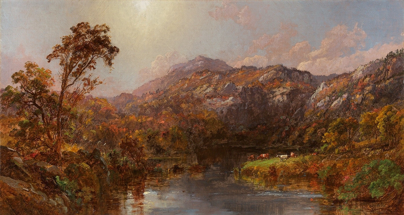 Hudson River Landscape with Couple, 1886, oil on canvas, 14⅛ x 26⅛ inches, signed and dated lower left: J. F. Cropsey 1886; Private collection, as reproduced in Anthony M. Speiser, ed., Jasper Francis Cropsey: Catalogue Raisonné, Works in Oil Volume III: 1885-1900, Watercolors: 1842-1900 (Hastings-on-Hudson, NY: Newington-Cropsey Foundation, 2019), 24.