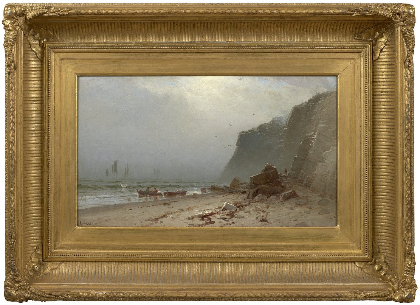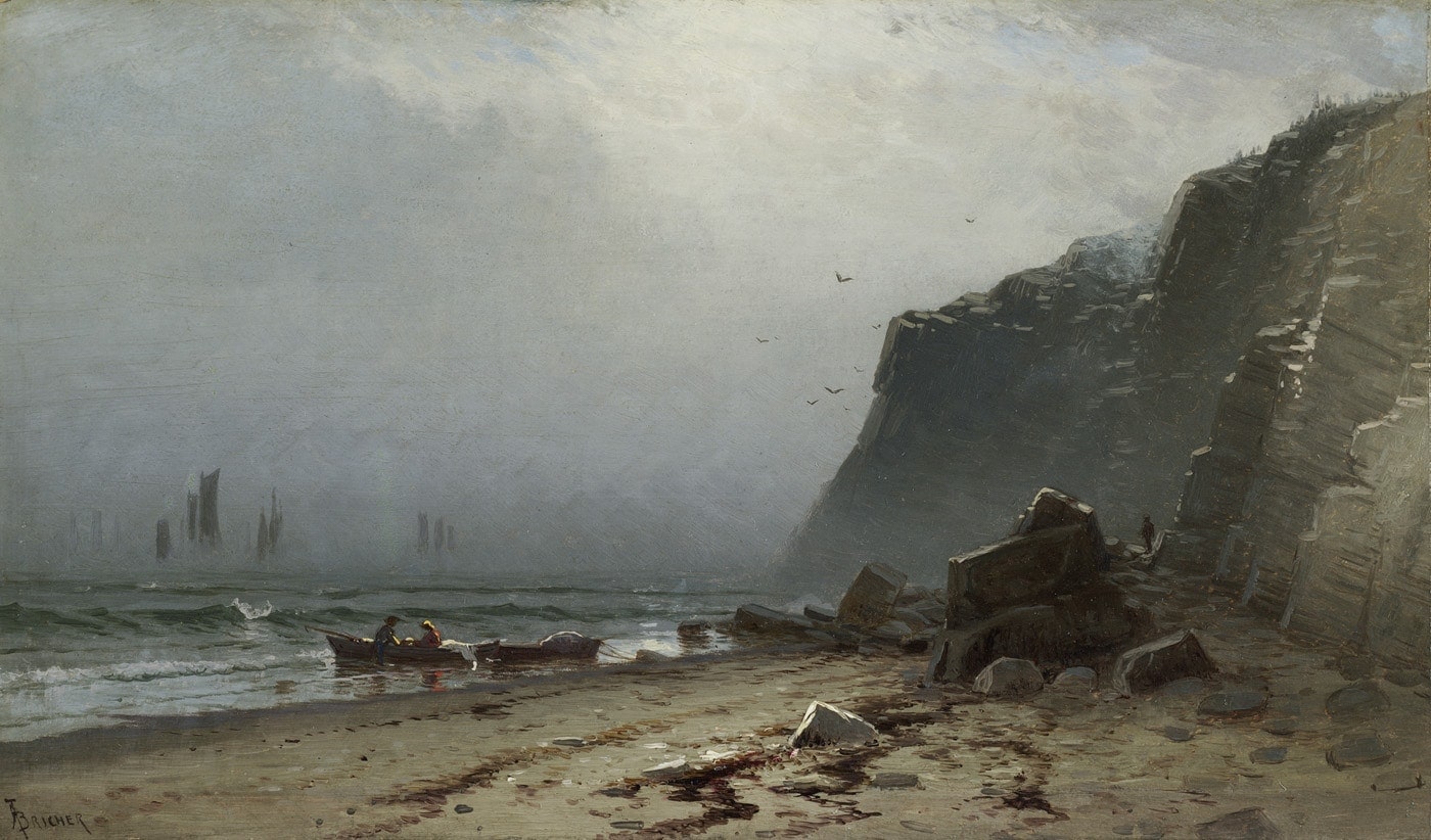 Bricher first visited Grand Manan Island, located in New Brunswick, Canada in 1876, and it soon became one of his favorite locales to paint. He exhibited a large work, A Lift in the Fog, Grand Manan, at the National Academy of Design that same year,[1] a more barren depiction of the setting compared to the breaking sunlight, birds, and figures in the present work.[2] In his survey of the luminist movement, John Wilmerding contends that Grand Manan inspired Bricher to create some of his most “eloquent Luminist oils.”[3]