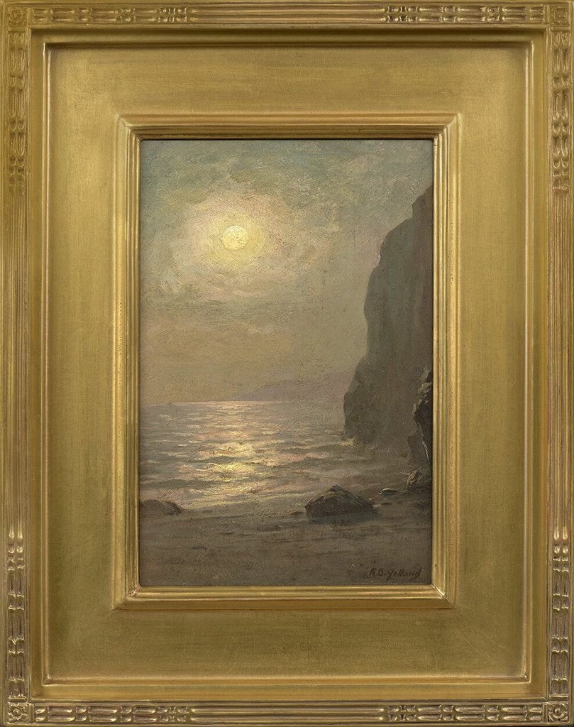 Note: Raymond Dabb Yelland rendered numerous coastal scenes, many depicting California’s shorelines. This work highlights the artist’s mastery of light, as the pale glow of the moon reflects onto the calm waves.