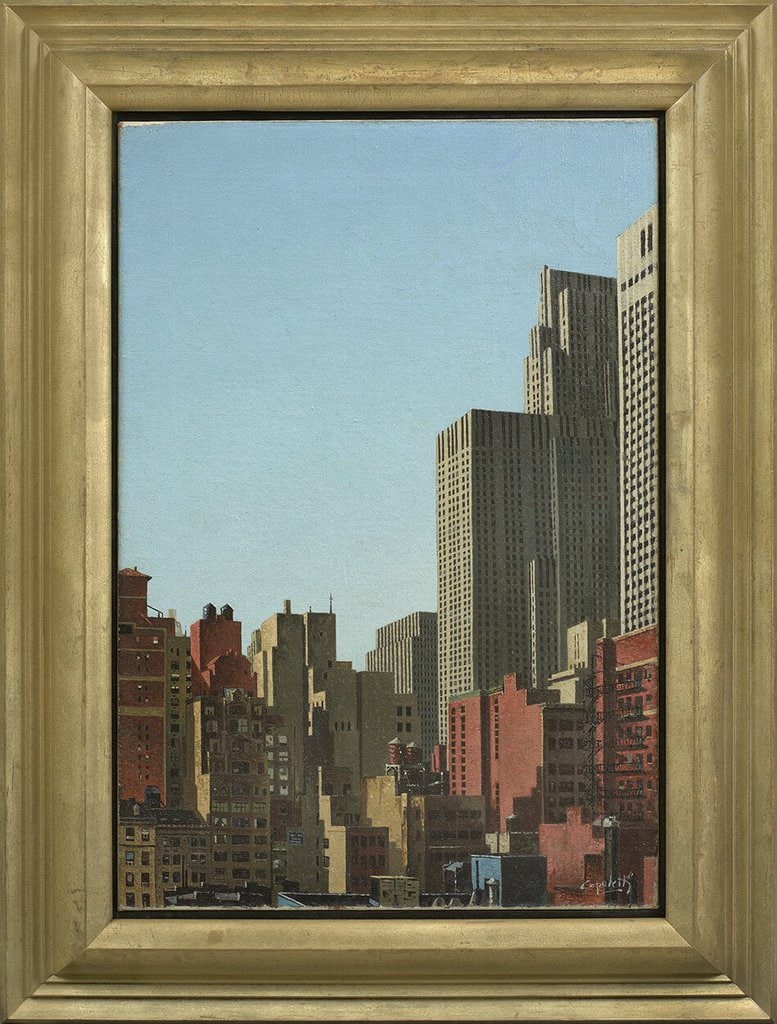 Note: In this work, José Manuel Capuletti captures a glimpse of the city from a high vantage point, showcasing the emblematic rooftop water towers, fire escapes, and geometric buildings of New York City.