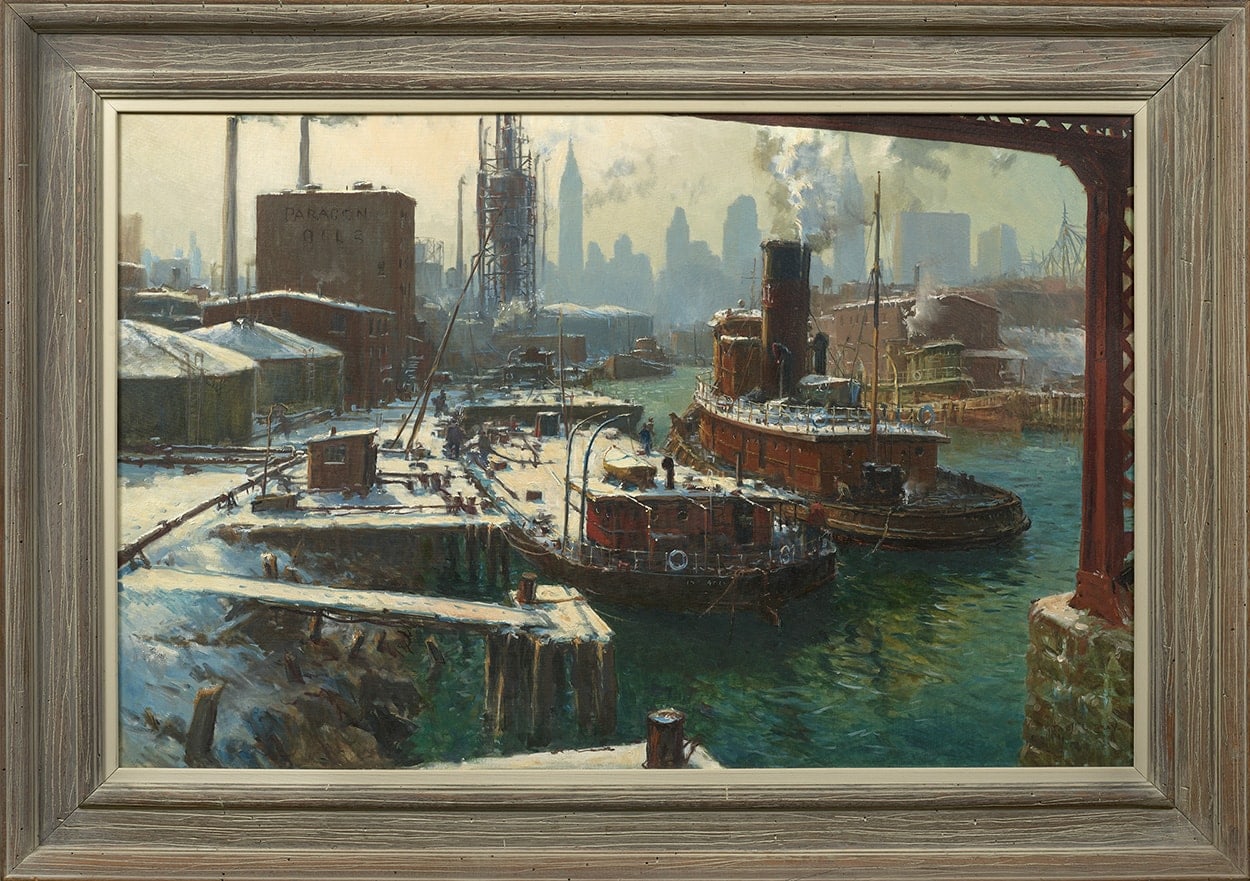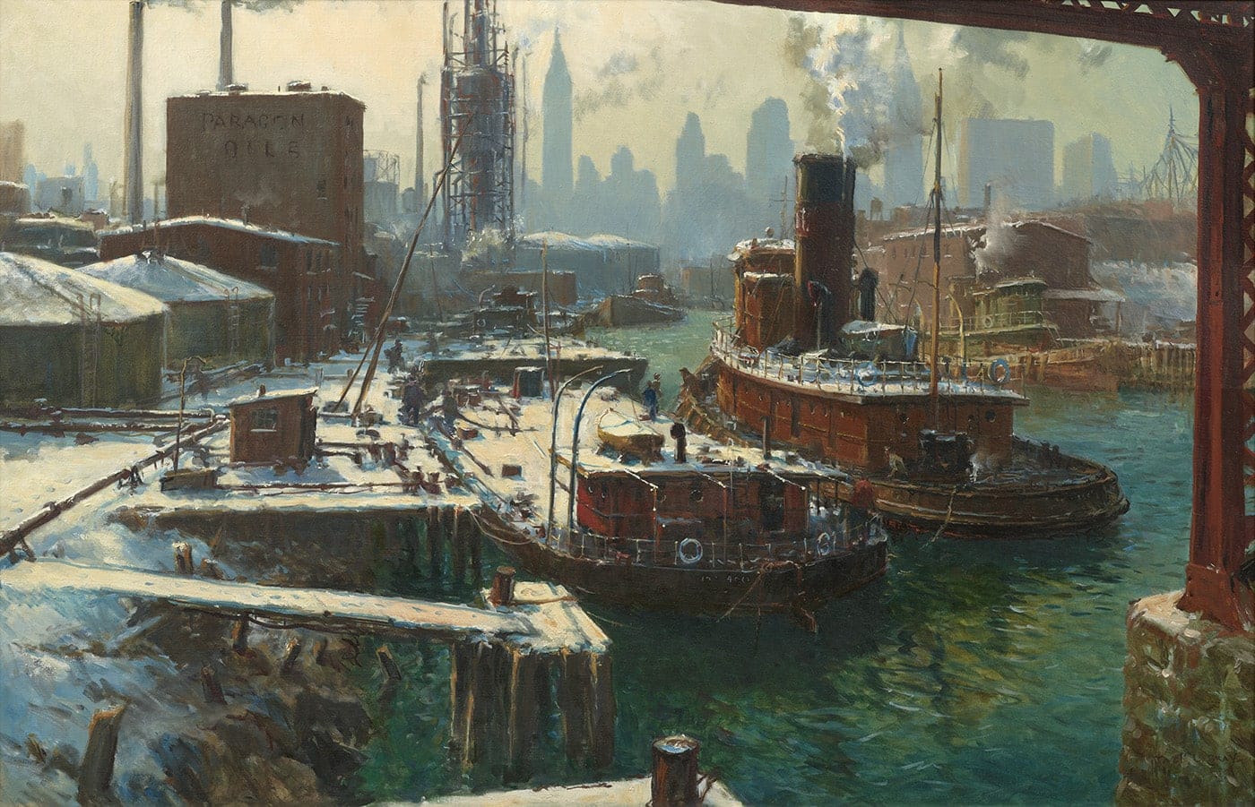 Note: Newtown Creek is a tributary of the East River running between Brooklyn and Queens in New York. By the early twentieth century, the area had become a major industrial site with numerous refineries active along its banks. Jack Lorimer Gray’s depiction of Newtown Creek features a Paragon Oil building on the left and smoke rising past the distant view of the Manhattan skyline.