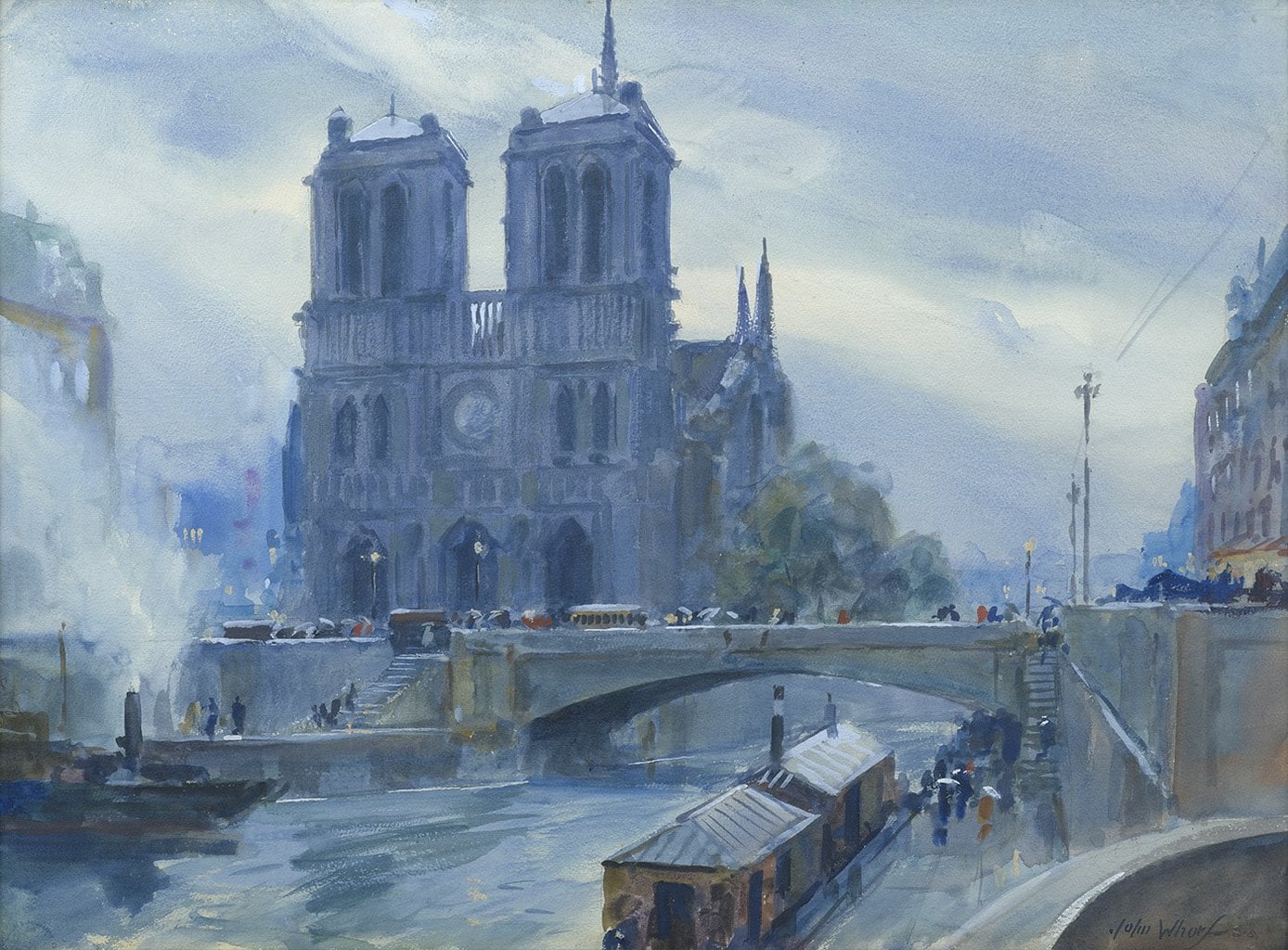 Note: Around 1919, John Whorf traveled to France while on an extended trip abroad. In Paris, he studied at the École des Beaux-Arts, Académie de la Grande Chaumière, and Académie Colarossi, and it was during this time that Whorf began using watercolor as his primary medium. He later returned to France with his wife, Vivienne Wing, on their honeymoon.
