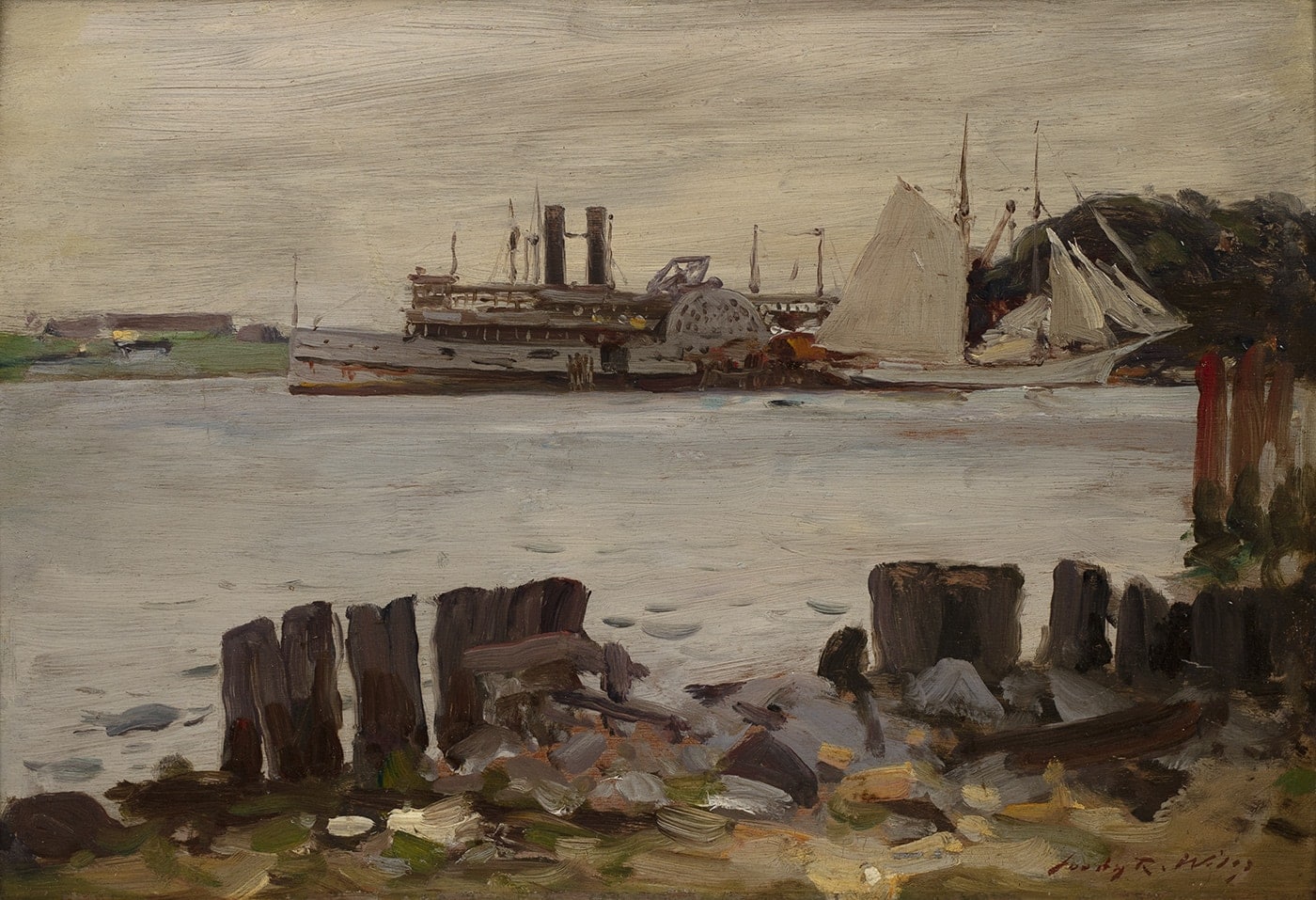 Paddle Wheeler and Schooner on the River, 1916