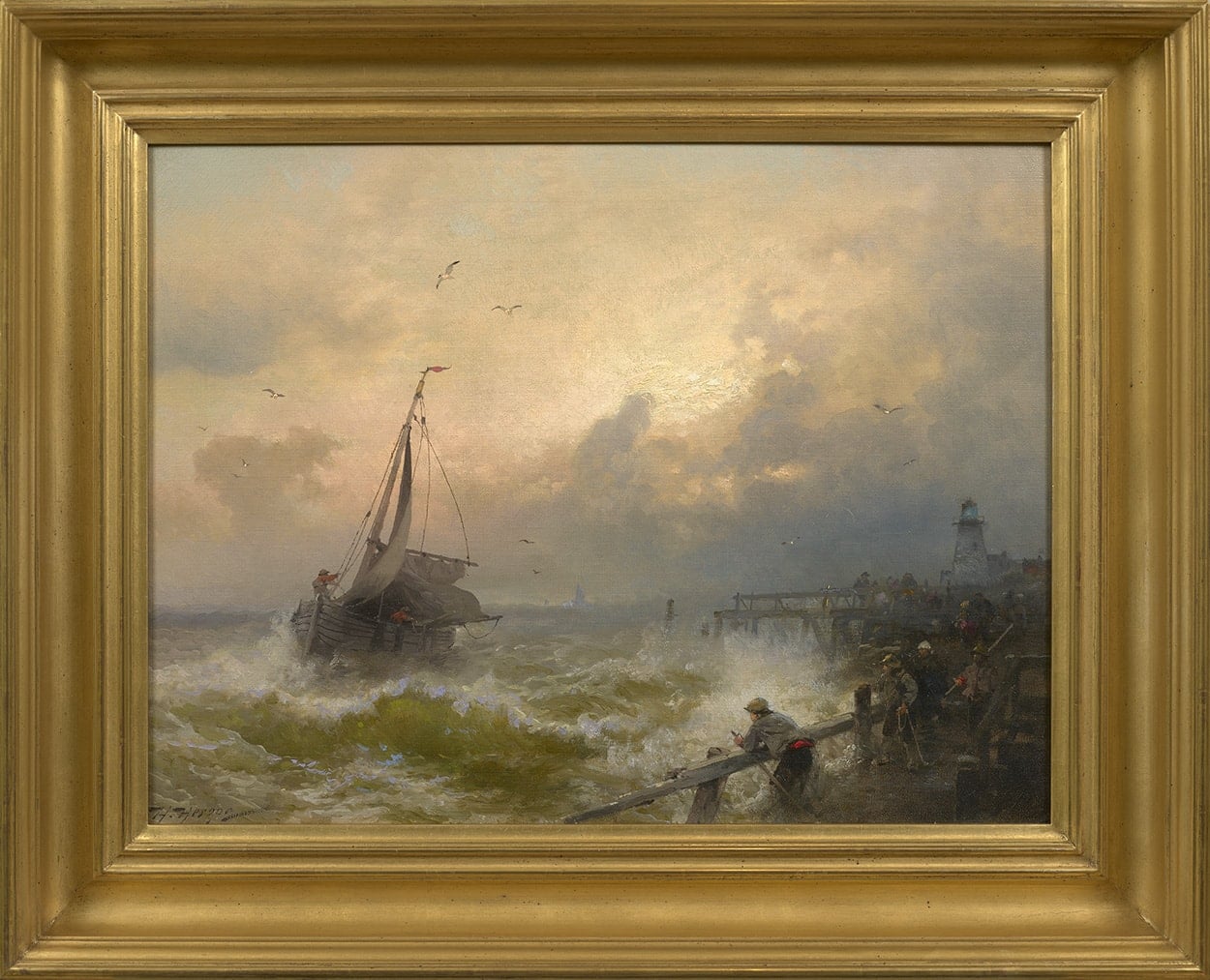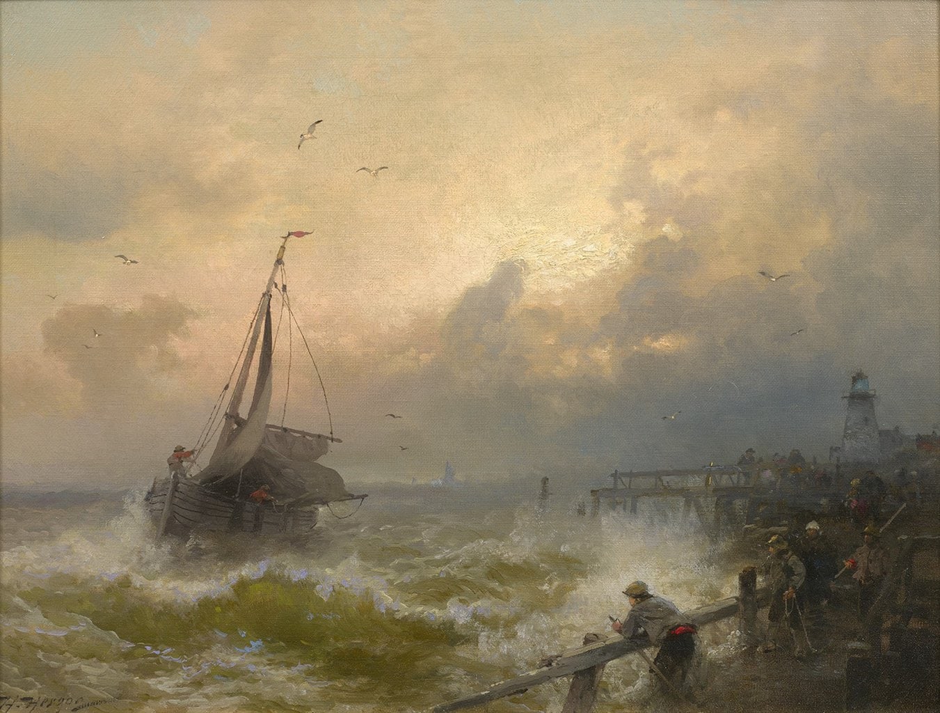 Note: Ship near Jetty is emblematic of Hermann Herzog’s fascination with the sublime, as he emphasizes the pure force of the gusting wind and raging waves.