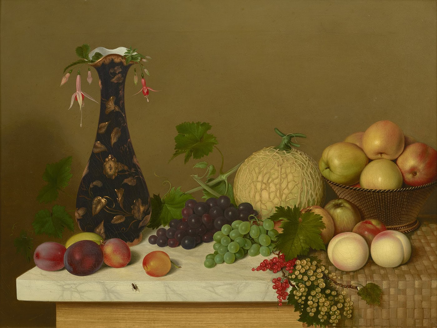The ostensible simplicity of the composition belies its careful construction. The earth’s bounty is tantalizingly arranged across a marble tabletop. Textures are lovingly depicted: gleaming porcelain, velvety peaches, translucent currants, reticulated cantaloupe skin, and serrated grape leaves invite the viewer to grasp at the canvas. While these contrasting elements provide an array of visual experiences, they are harmoniously balanced through light, color, and form. The objects are displayed at their best, each surface evenly illuminated and flaunting jewel-like tones. The rounded forms of the fruits echo the curvilinear vase and its drooping sprigs of fuchsia. The vertical thrust of the vase helps to enliven the overall horizontal arrangement.