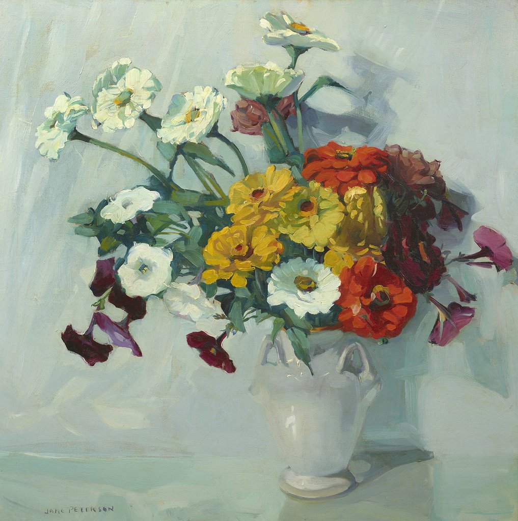 Note: Jane Peterson painted an increasing number of floral arrangements following her marriage in 1925. For the artist, each cut flower offered a varied ephemeral beauty to understand. Peterson described, “The reason I paint flowers is because of all things in the world, I think flowers the most beautiful,” continuing, “Nature has expended on them a marvelous wealth of color—they scintillate the prismatic hues of the rainbow; they harmonize the pastel shades of the night; they are all that is delicate; all that is lurid, brilliant, bizarre. They are living things with personality and refinement, with delicacy of form and structure, with variety of size and shape, with rhythm and charm of arrangement, with grace and dignity of bearing.”[1]