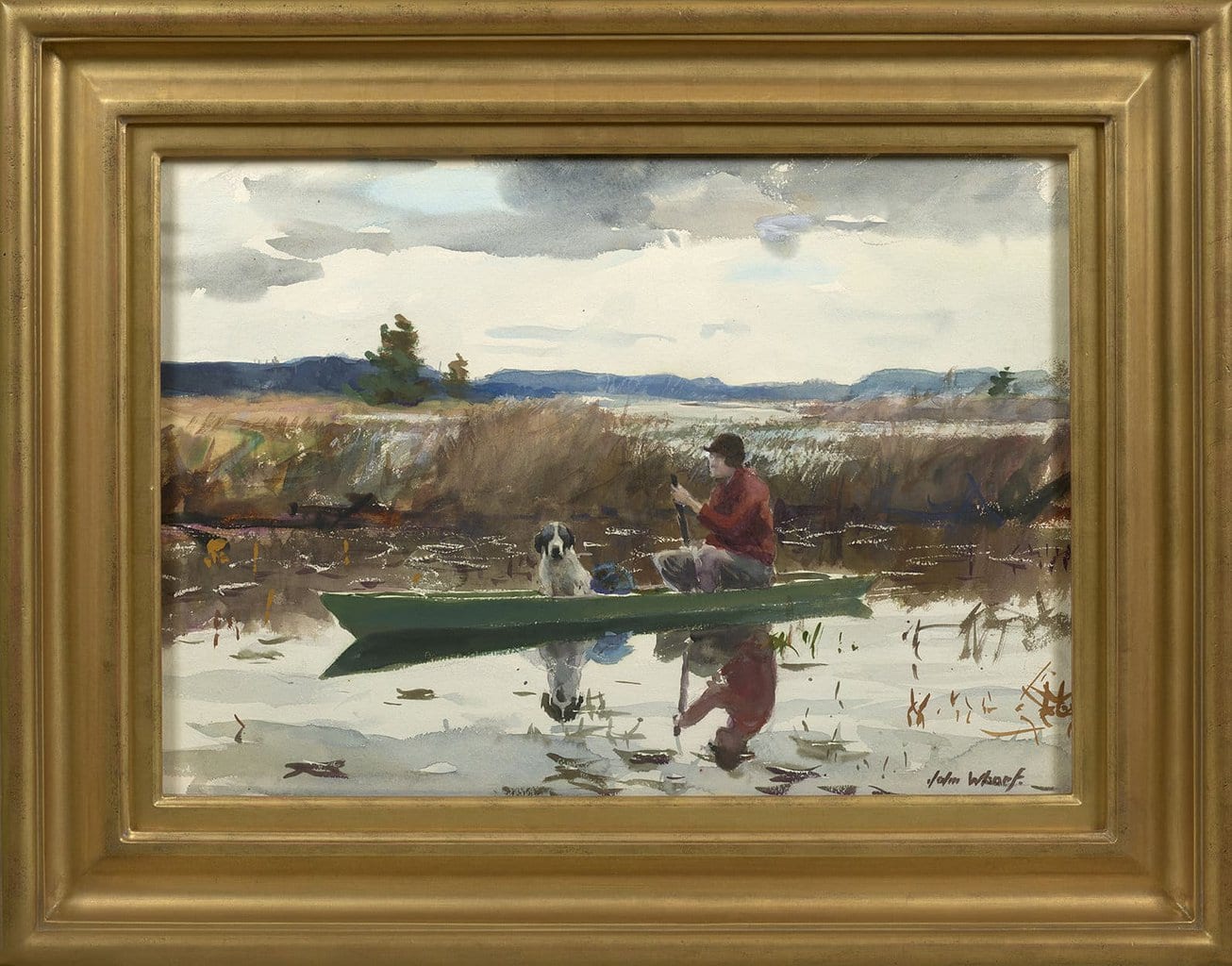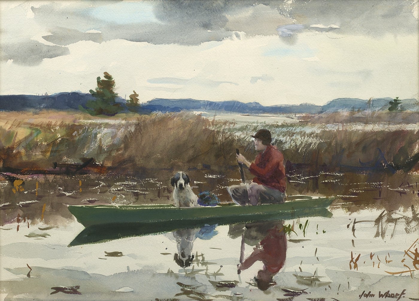 Signed lower right: John Whorf; on verso: Swamp Country / Man with Otter Hound