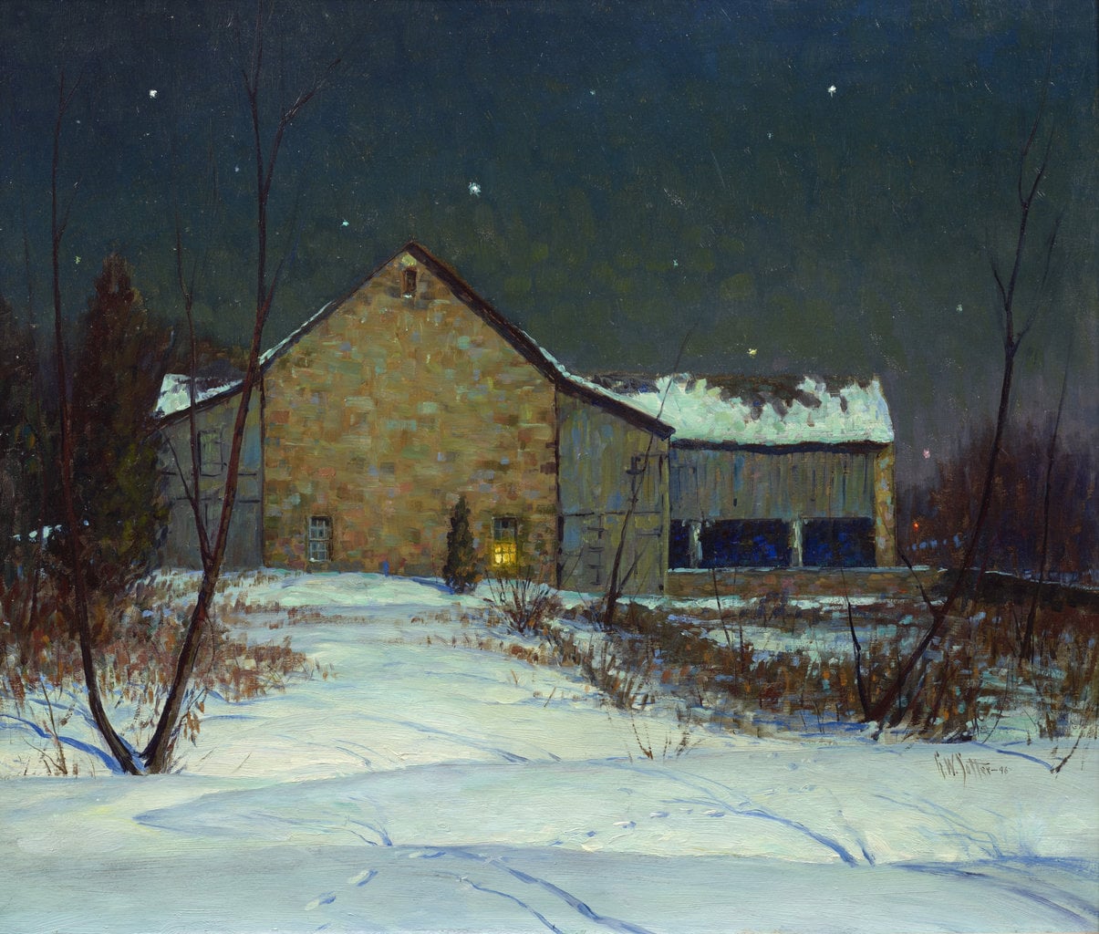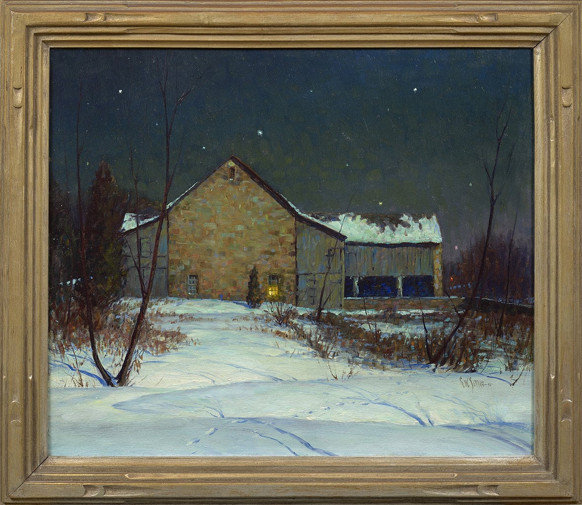 Note: George William Sotter is perhaps best known for his picturesque night scenes. In this work, moonlight cascades across the snowy lawn, giving the nocturnal scene a luminous glow. The painting depicts Sotter’s studio in Holicong, Pennsylvania.