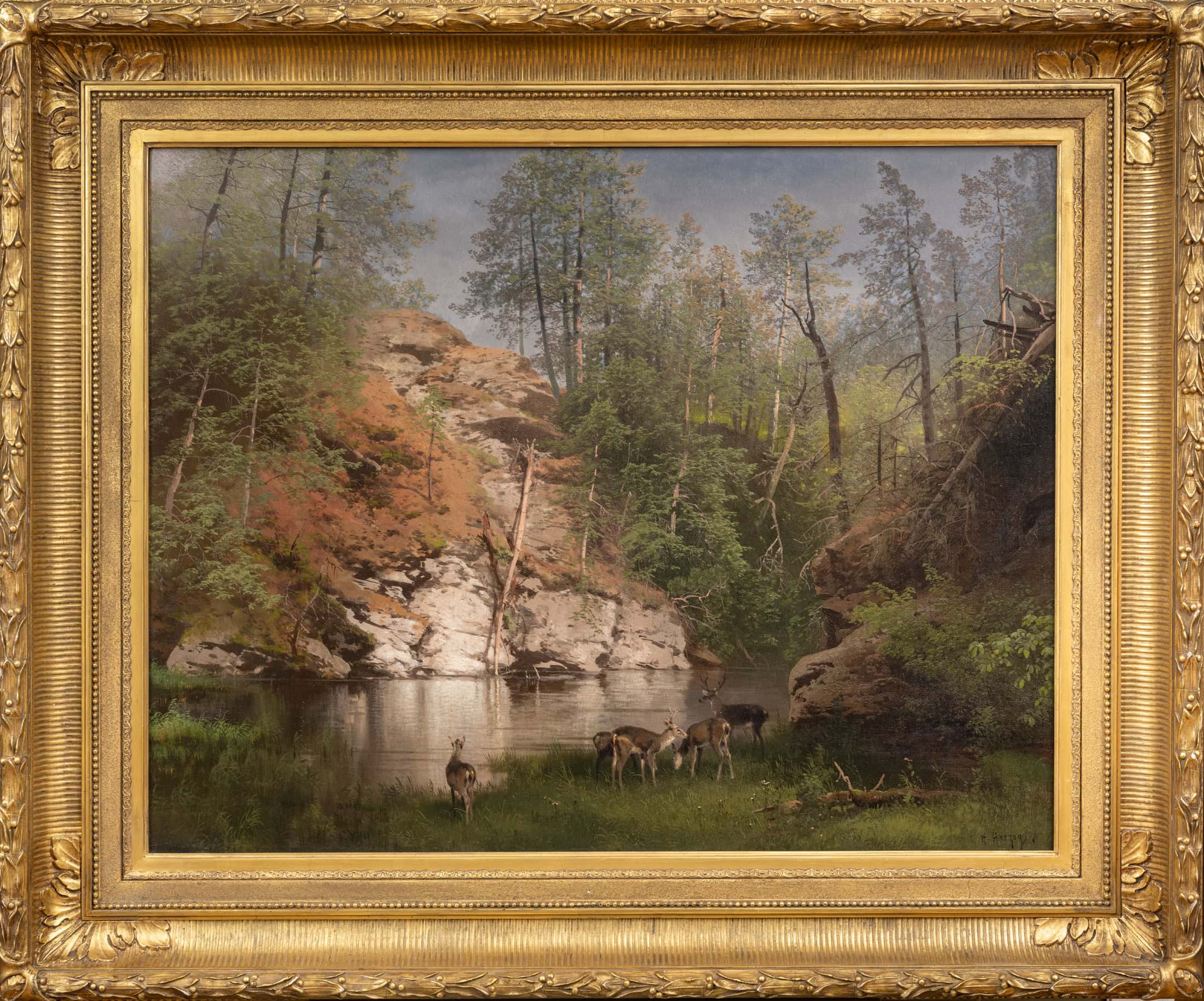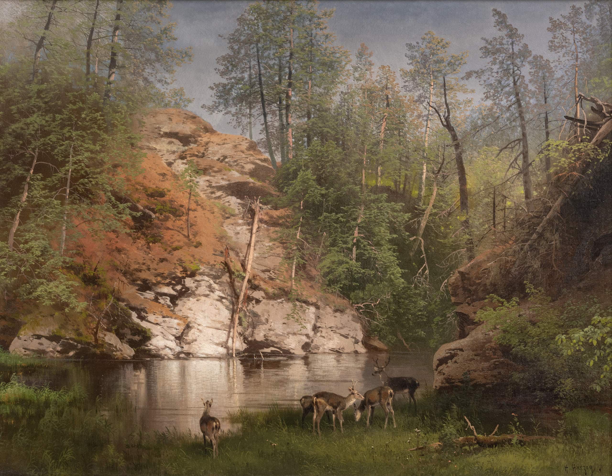 Woodland with Deer, oil on canvas, 16 x 19 1/2 in, signed lower left: H. Herzog; The Charles Hosmer Morse Museum of American Art, Winter Park, Florida