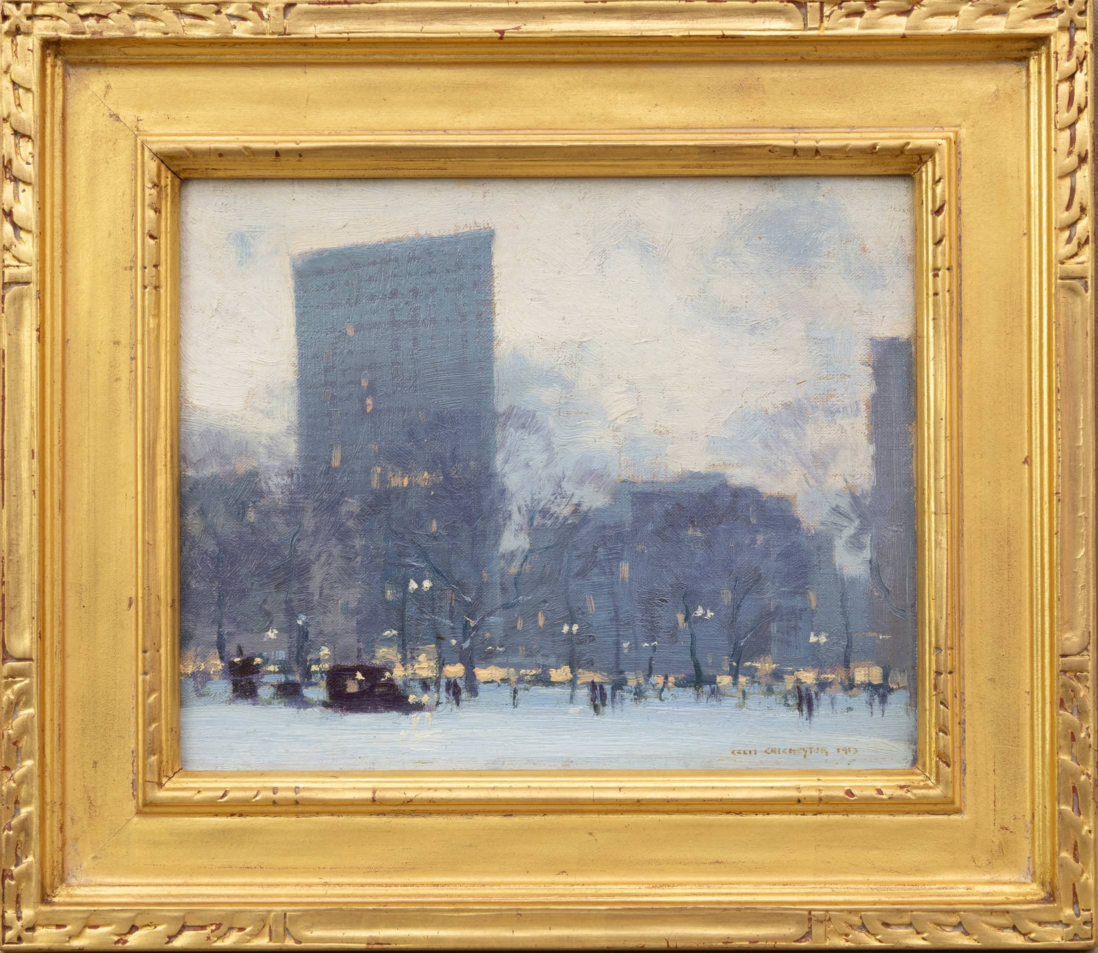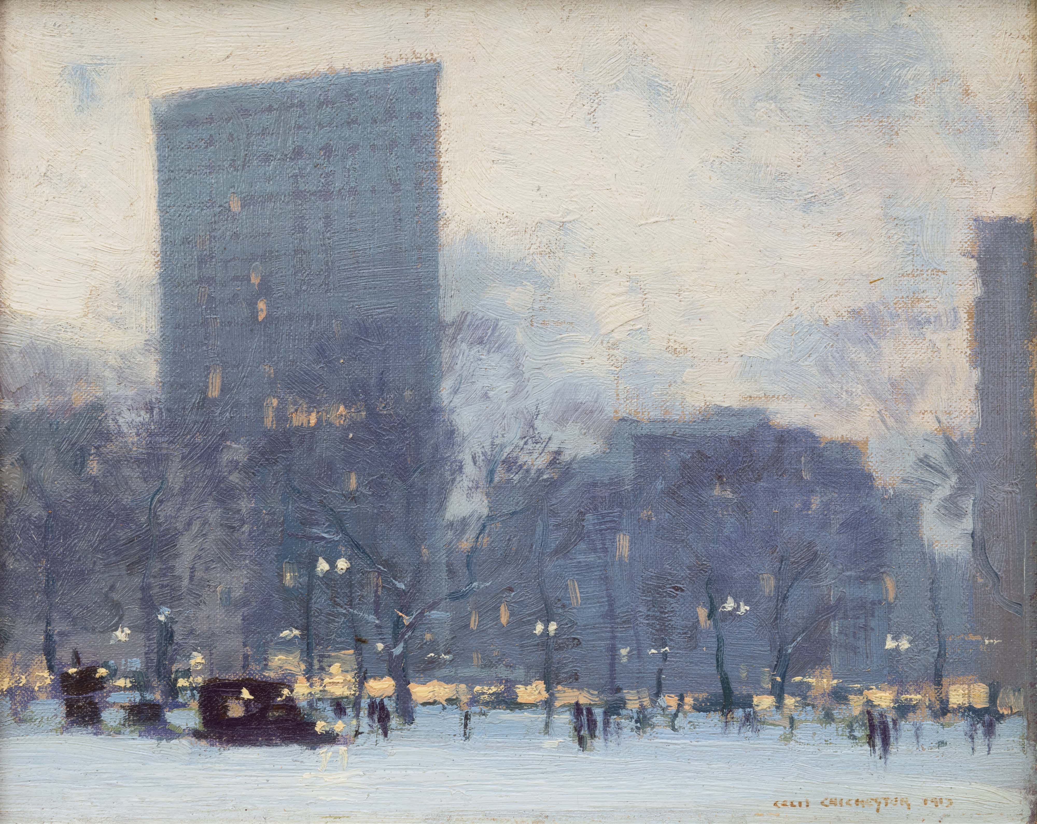 The painting depicts the urban landscape of Manhattan in 1913, while also highlighting Cecil Chichester’s particular focus on light: the gradually fading natural light of the evening sky, as well as the artificial light from the gas lamps in Madison Square Park and the illuminated windows of the Flatiron Building.