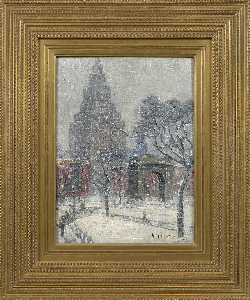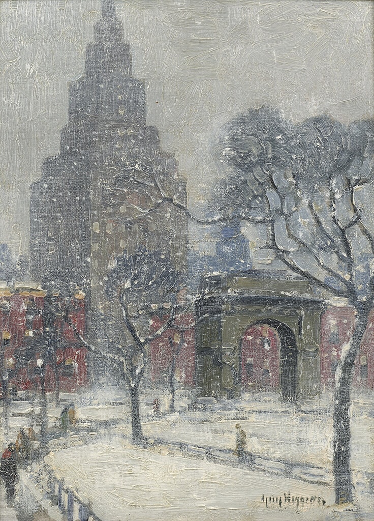 Note: Guy C. Wiggins is admired for his impressionistic scenes of New York. The artist had a particular interest in rendering the city’s landmarks in winter, blanketed with snow. Wiggins had a studio near Washington Square Park and depicted the square with its iconic marble arch in several paintings.