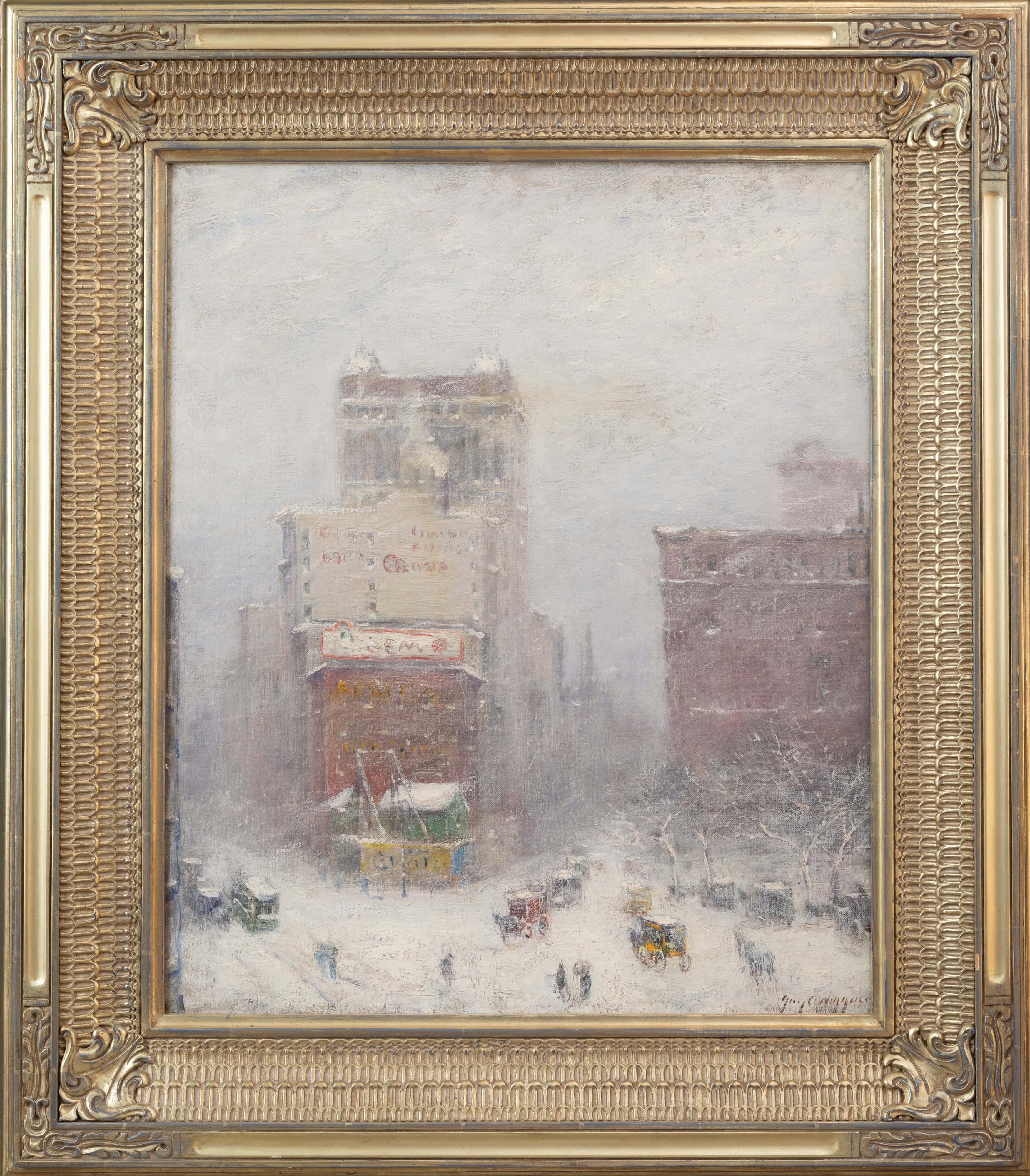 Guy C. Wiggins was renowned for painting scenes of New York City, particularly winter cityscapes. This choice of subject matter may have been inspired by his teacher, Robert Henri (1865–1929), who encouraged his students to seek inspiration from the streets and daily life of New York City. Winter on Madison Avenue is an extraordinary example of Wiggins’ New York City winter street landscape series. His distinctive style harmoniously combines the vibrancy of the city with the tranquility of nature, establishing him as a significant figure in American Impressionism.