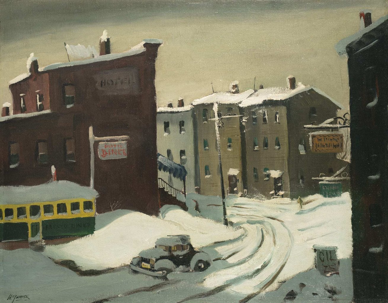 Henry Martin Gasser (1909–1981), City in Snow, oil on board, 15 15/16 x 19 15/16 inches, signed lower left: H.GASSER